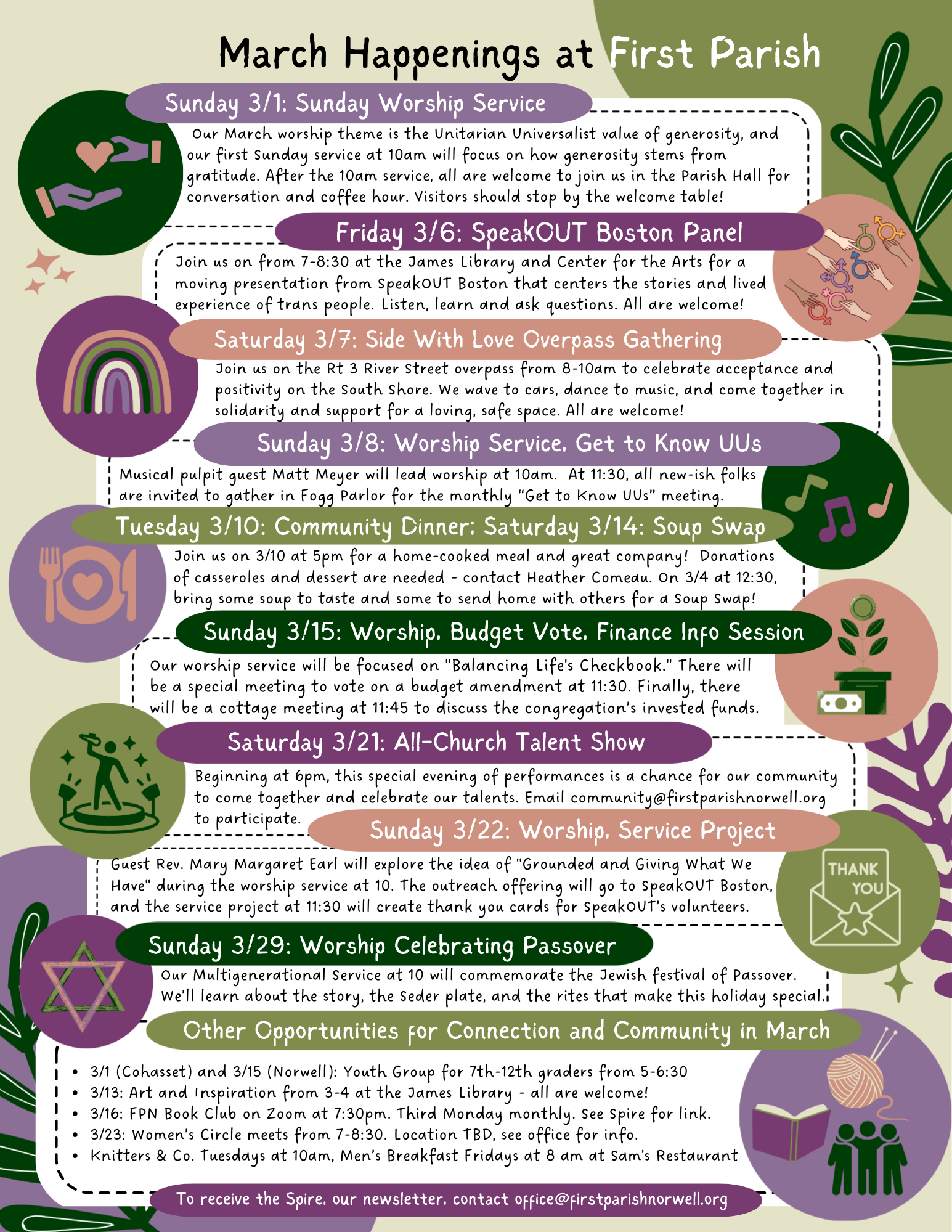 Our March worship theme is "Generosity." We hope you will join us one or all of the Sundays!